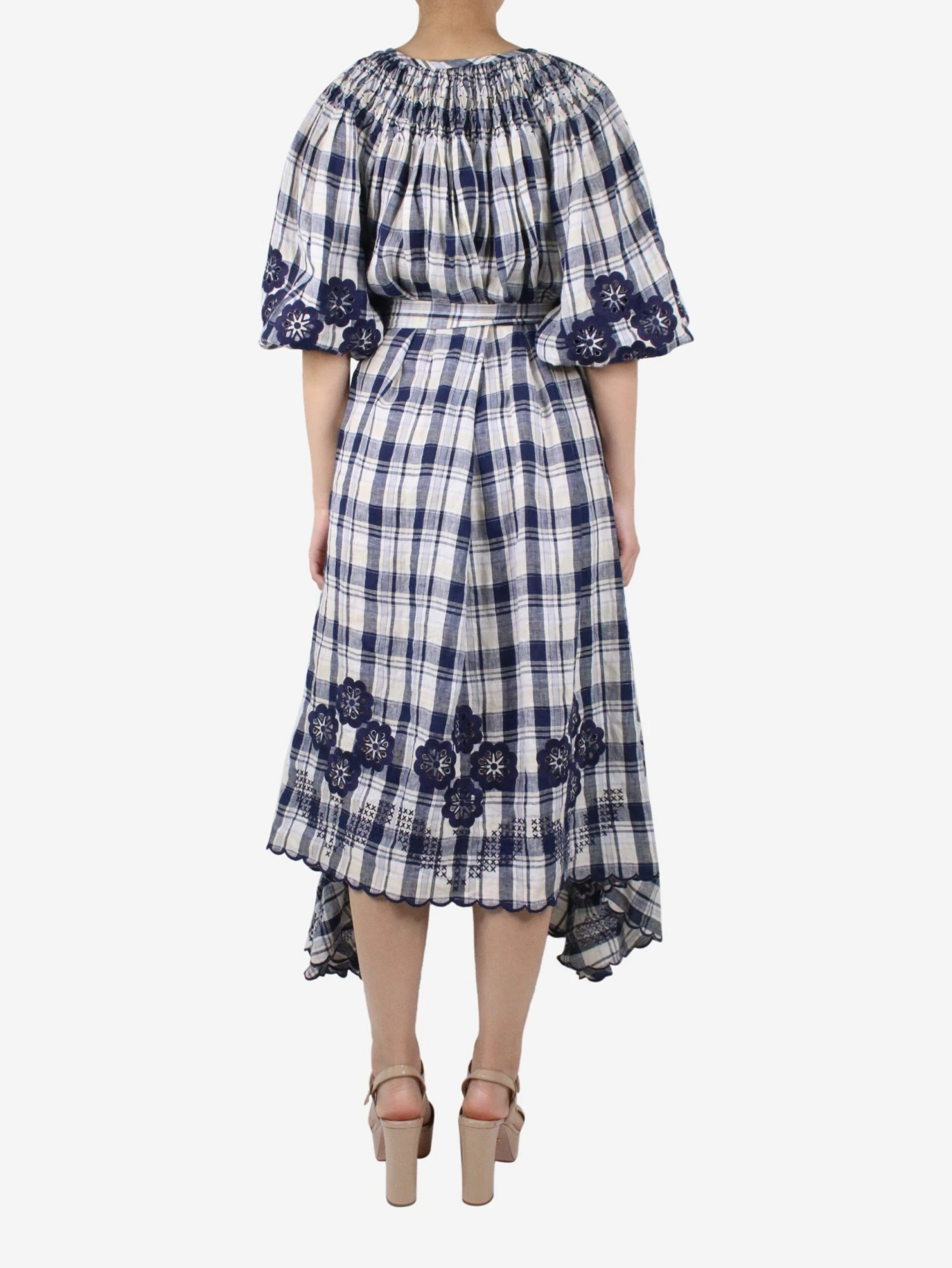 Innika Choo blue and white puff-sleeved check embroidered dress. Comes with belt.