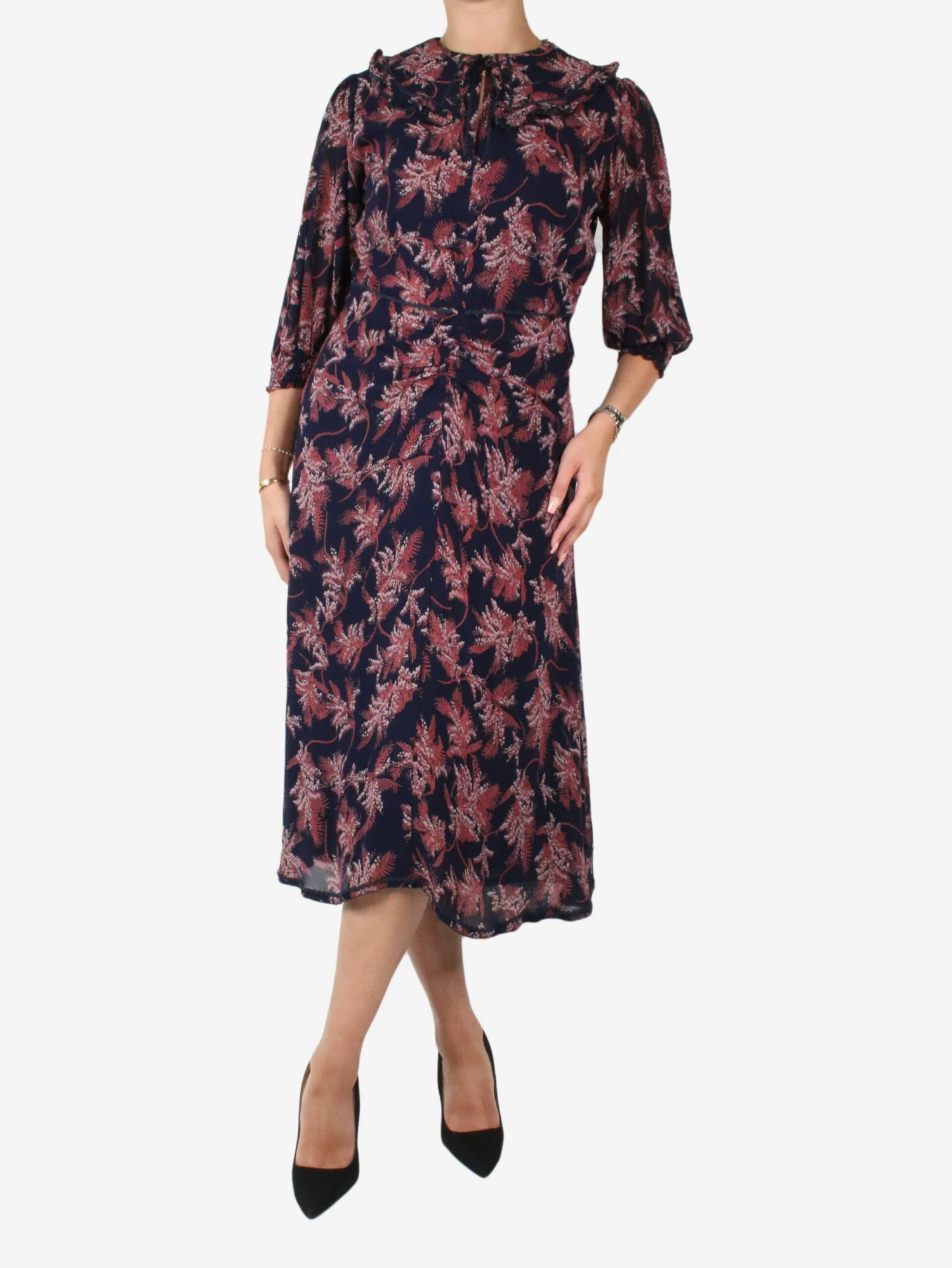 Brora blue long-sleeved floral printed midi dress with a ruffled collar, keyhole neck and gathered waist. x000d