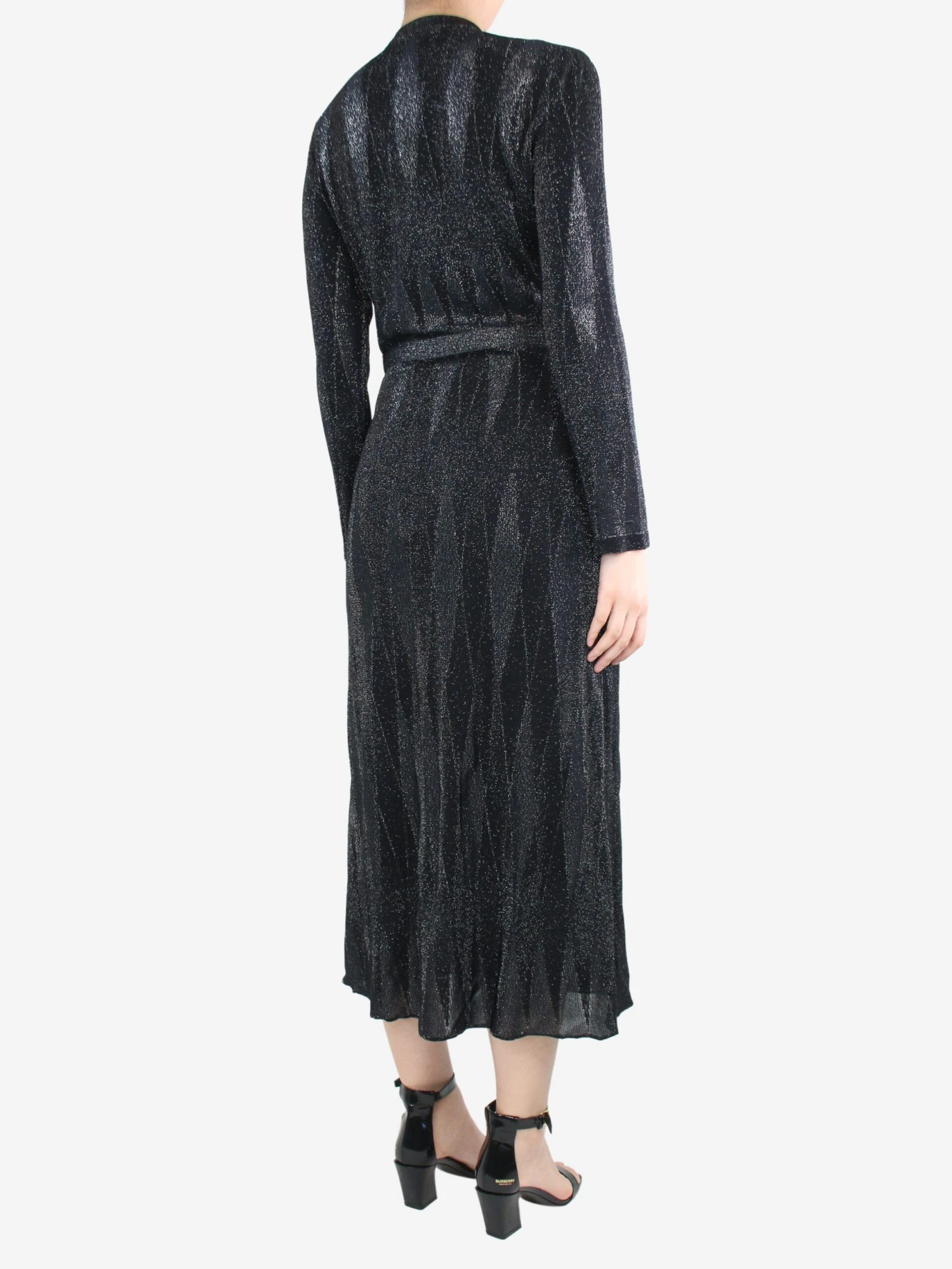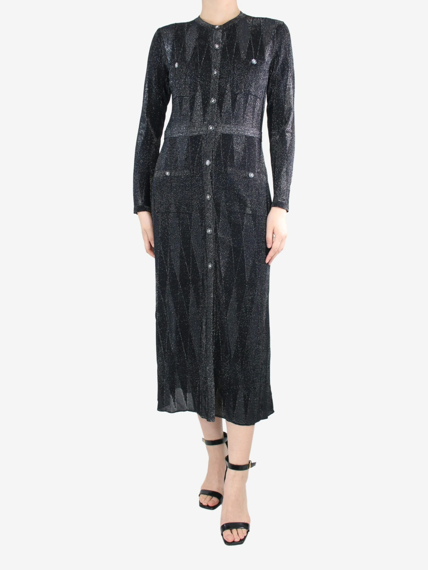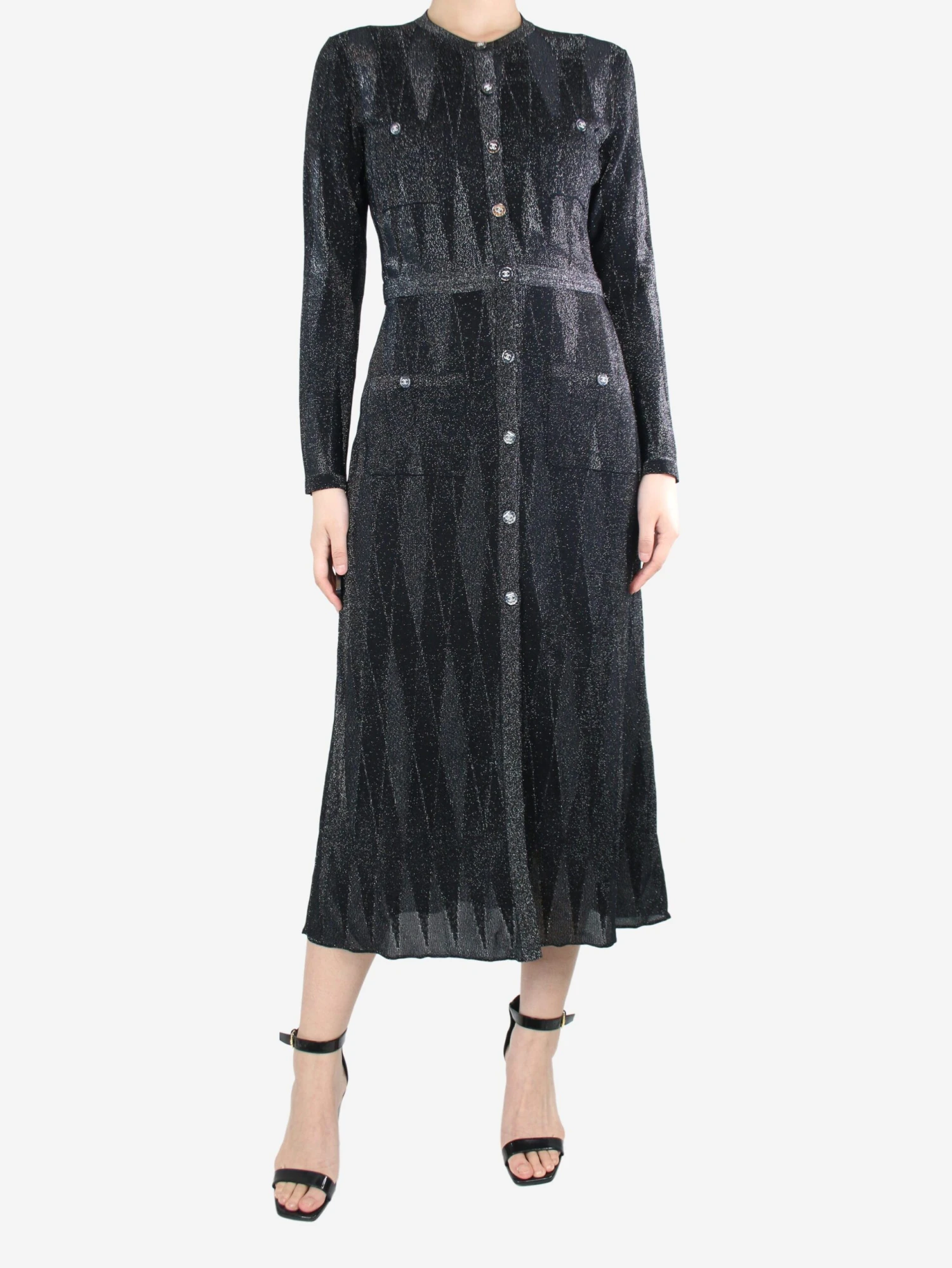 Chanel black and grey sparkly buttoned midi dress, with branded buttons.
