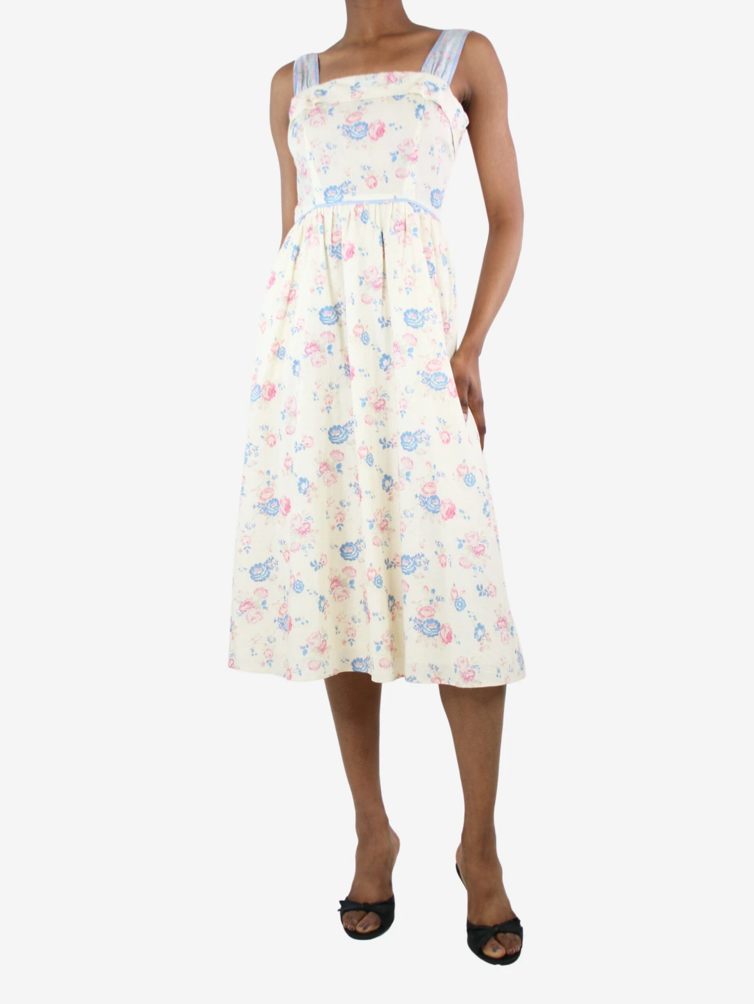 Love Shack Fancy cream, blue and pink sleeveless floral-printed midi dress.