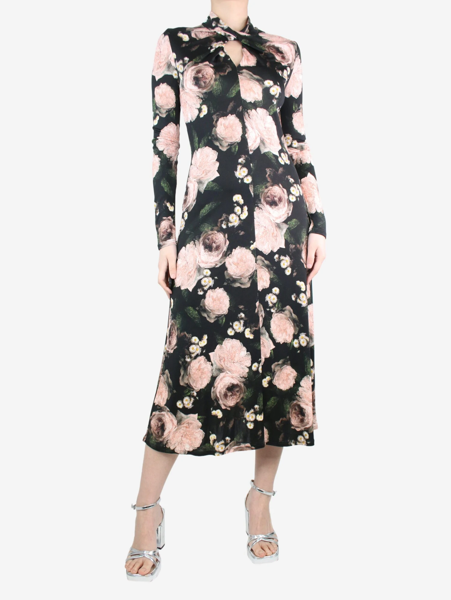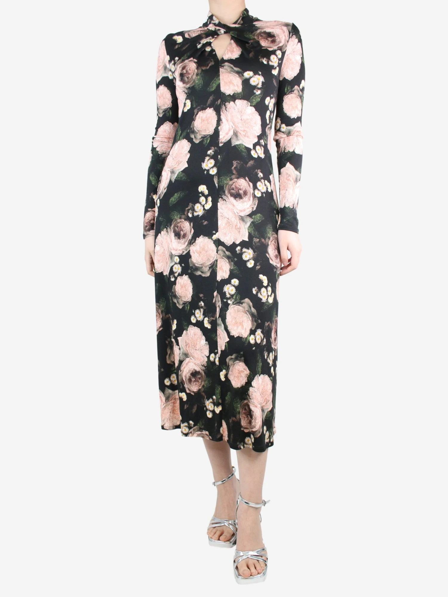 Erdem black long-sleeved floral printed midi dress with twist detail on the neckline.
