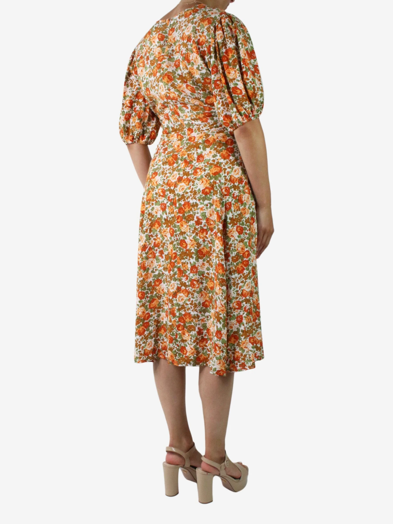 Faithfull The Brand orange puff-sleeved floral printed midi dress with wrap-around belt.