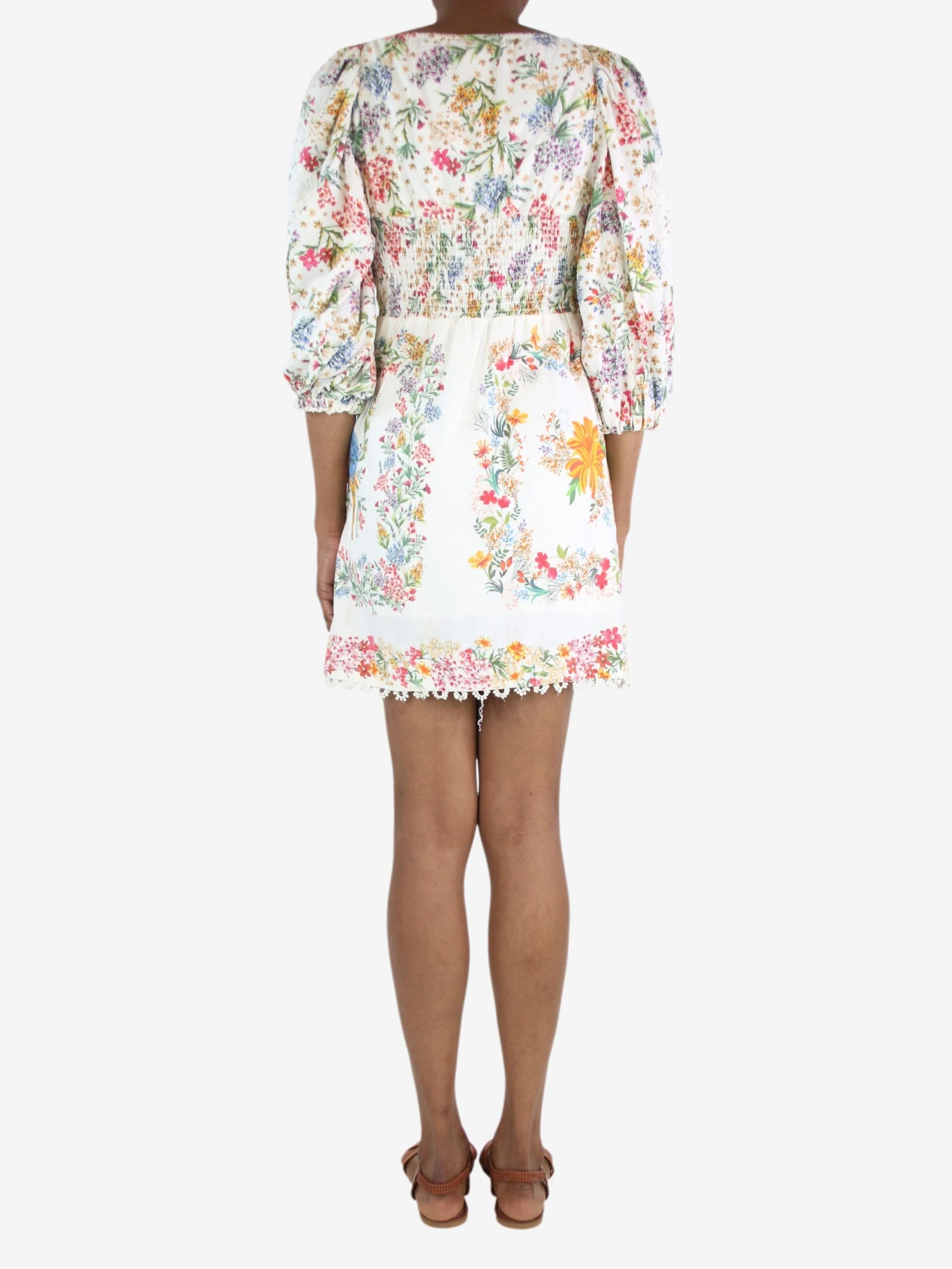 Farm Rio white puff-sleeved embroidered floral midi dress.