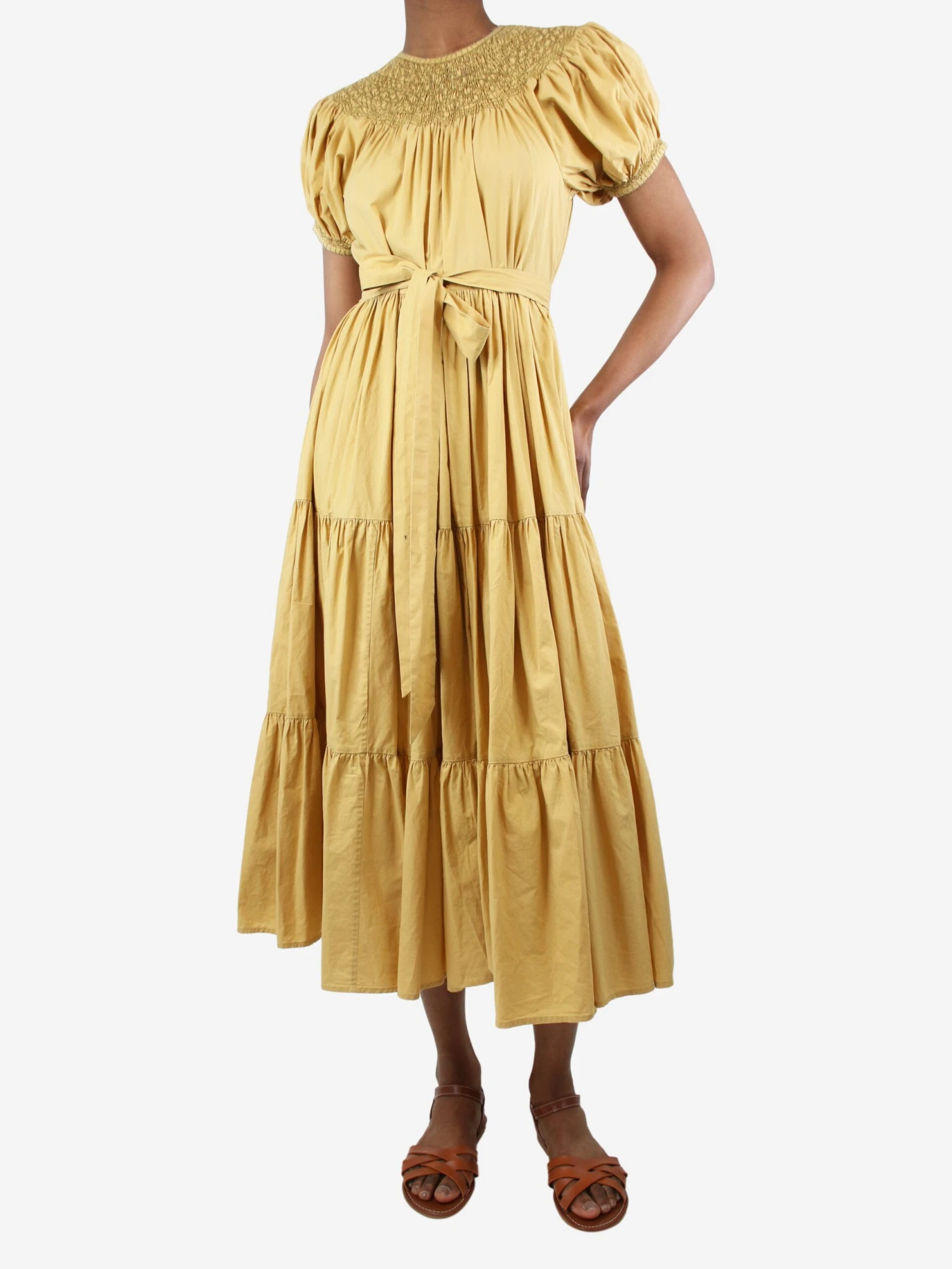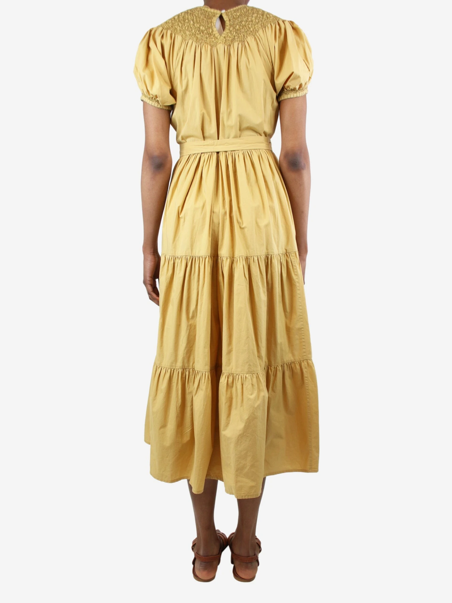Doen flax yellow smocked tiered cotton dress with puff-sleeved.