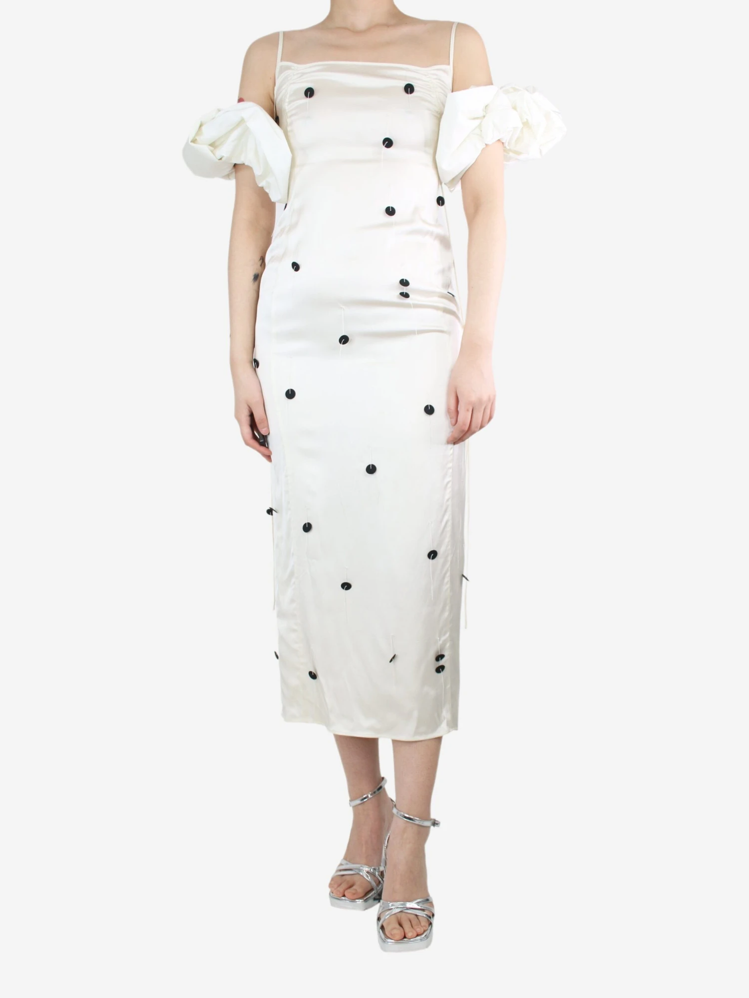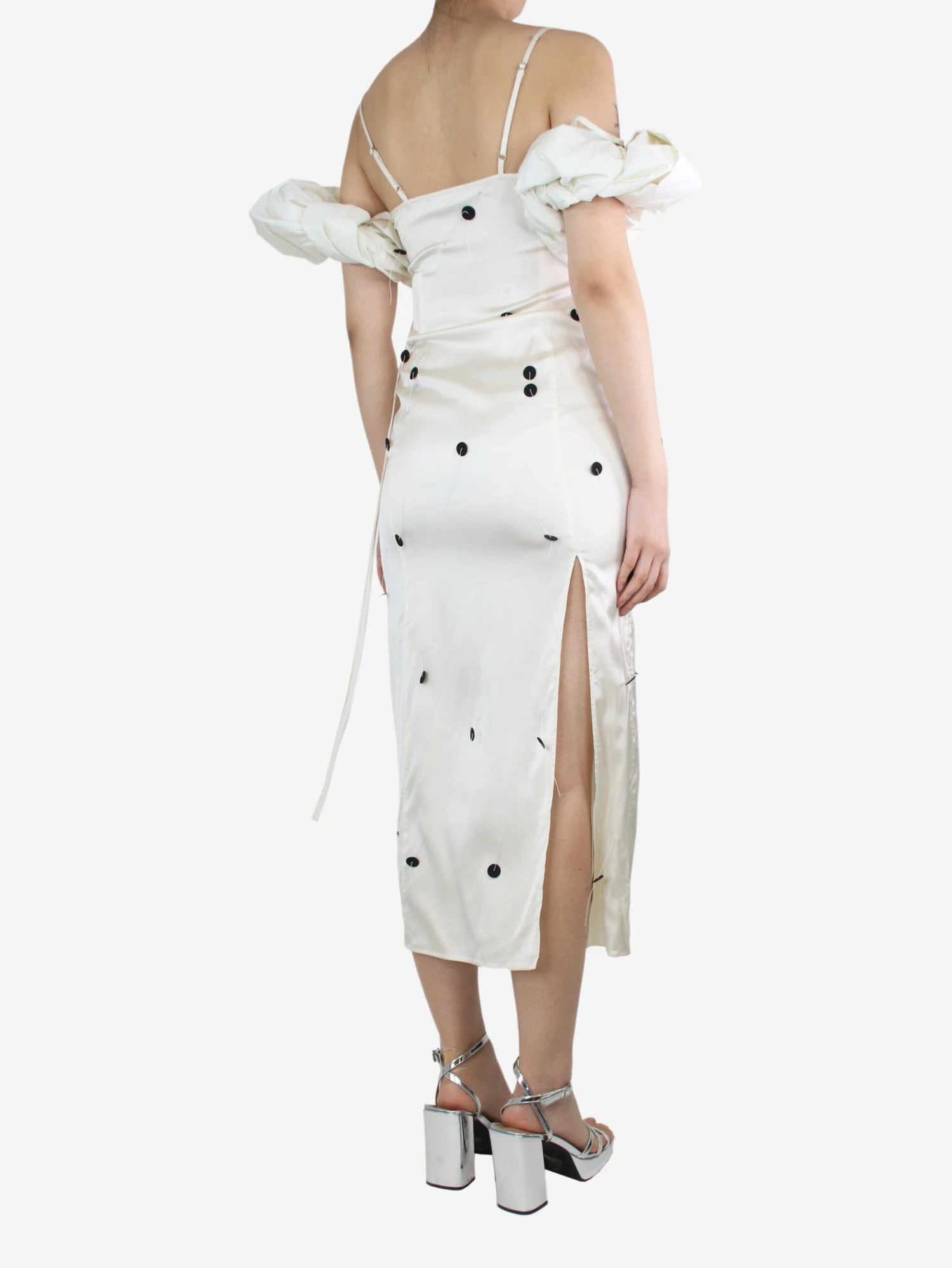Jacquemus cream puff-sleeved midi dress with polka dot applique detail and a side-slit.Â