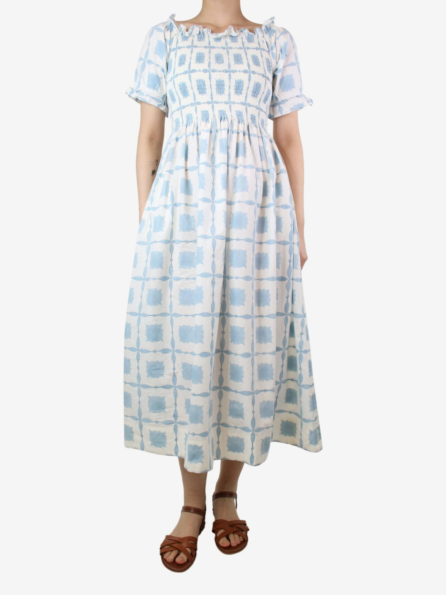 Daydress light blue and white smocked cotton printed dress with a ruffled trim.