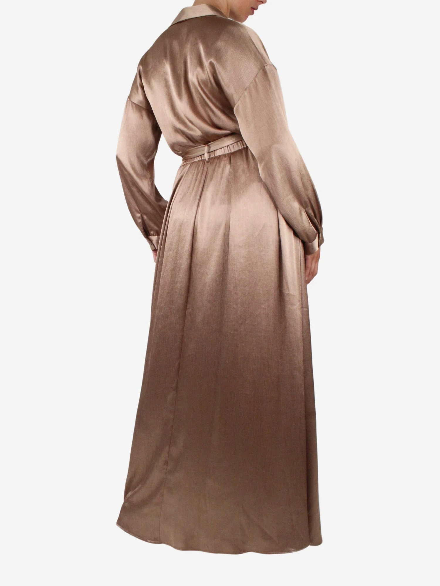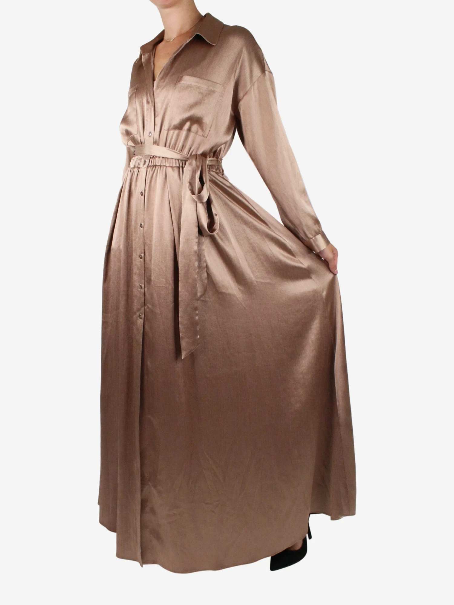L’Agence neutral belted plissé-satin maxi shirt dress.