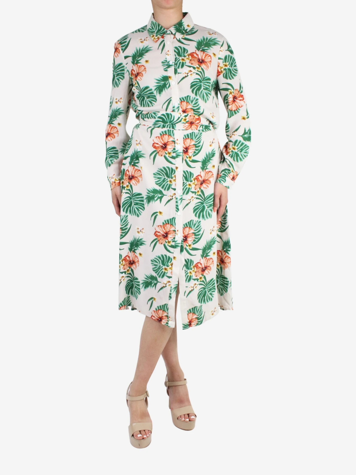Amare neutral floral button-up midi dress with belt.