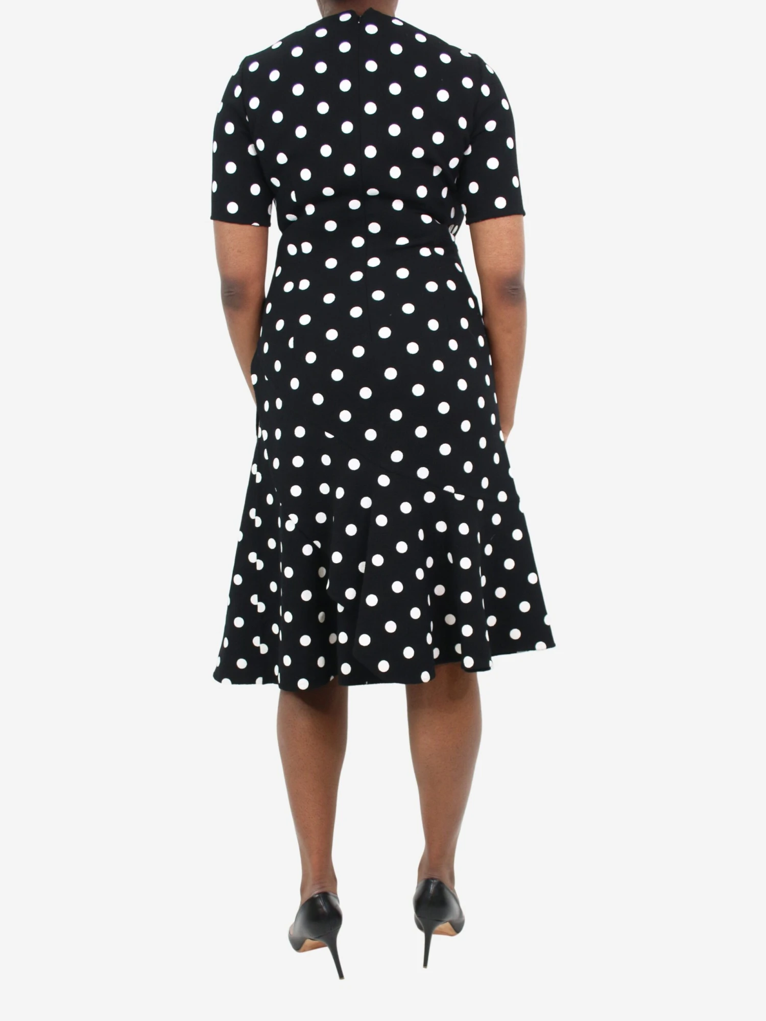 Oscar De La Renta black short-sleeved polka dot dress with a ruffled hem.