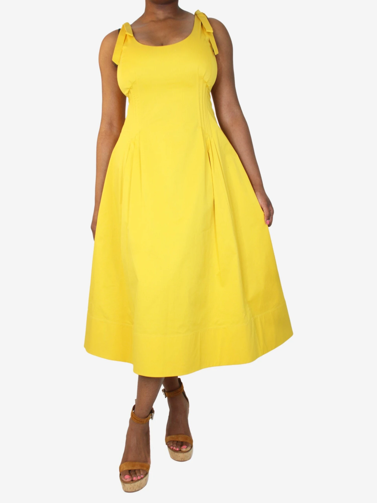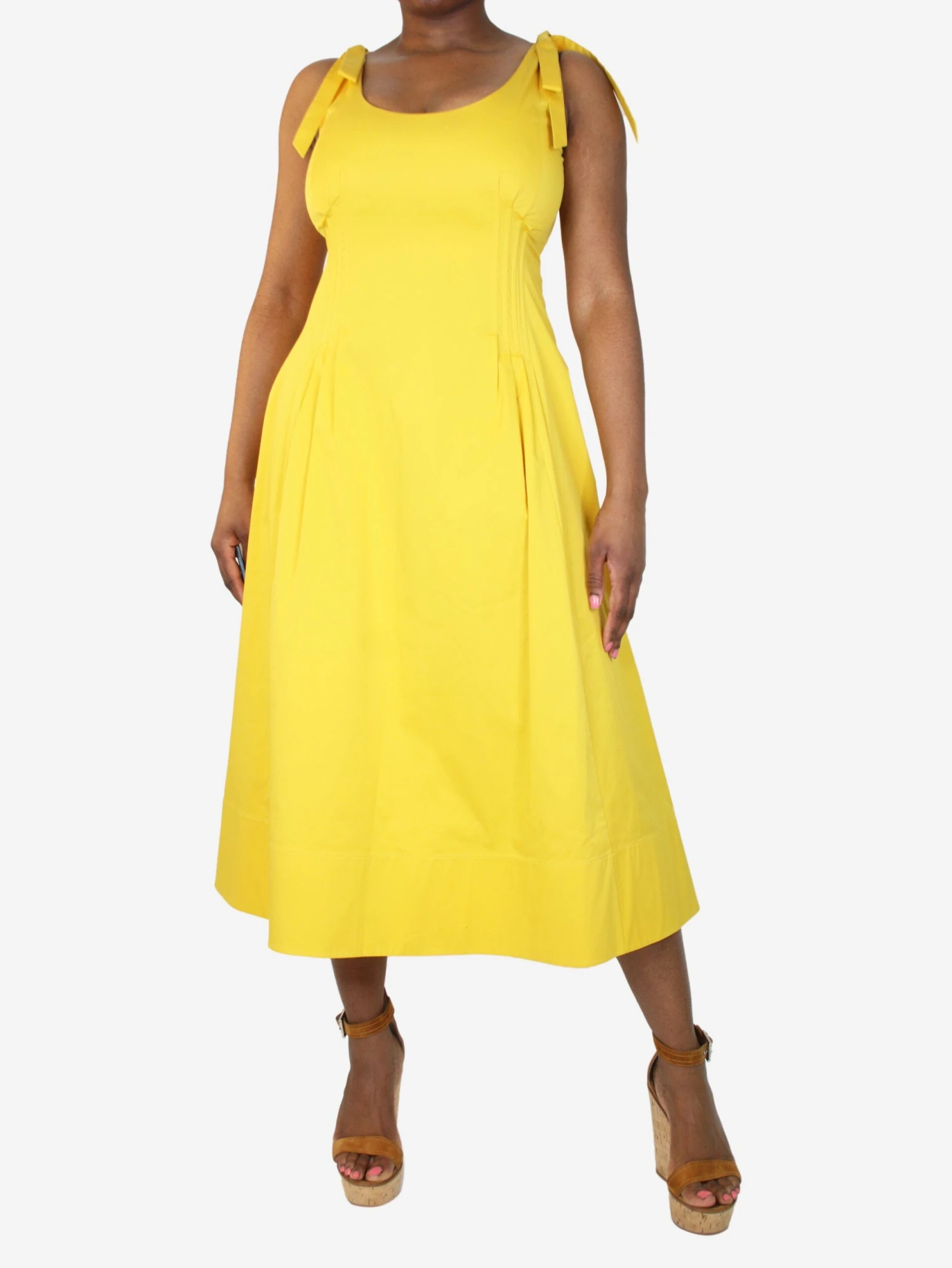 Oscar De La Renta yellow sleeveless knot dress with a pleated front.
