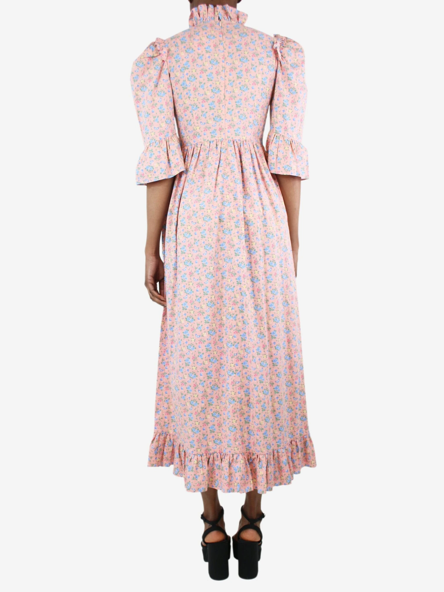 Batsheva pink high-neck floral printed midi dress. x000d