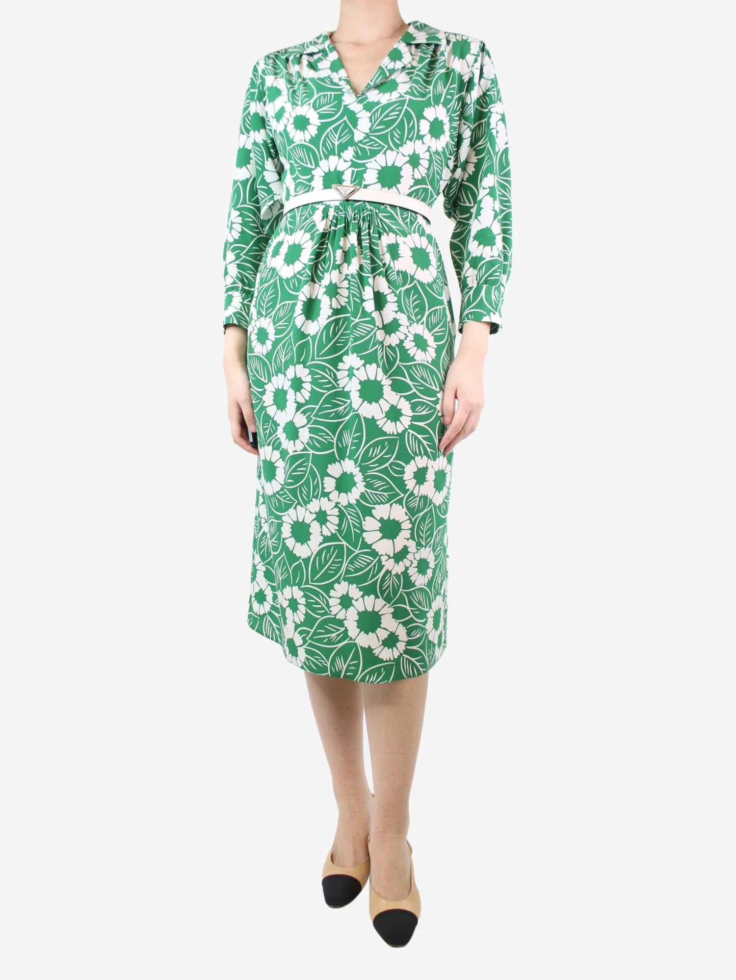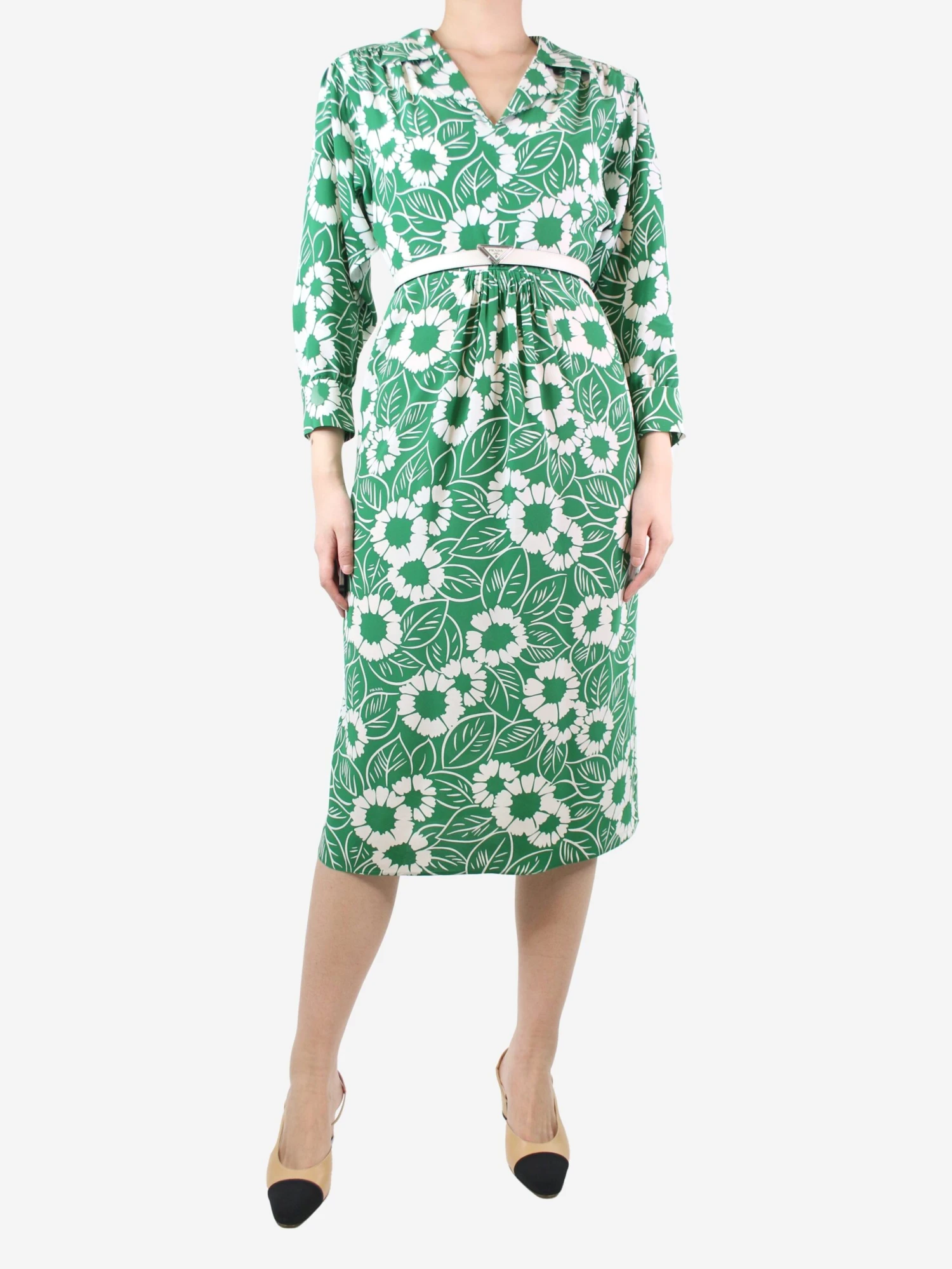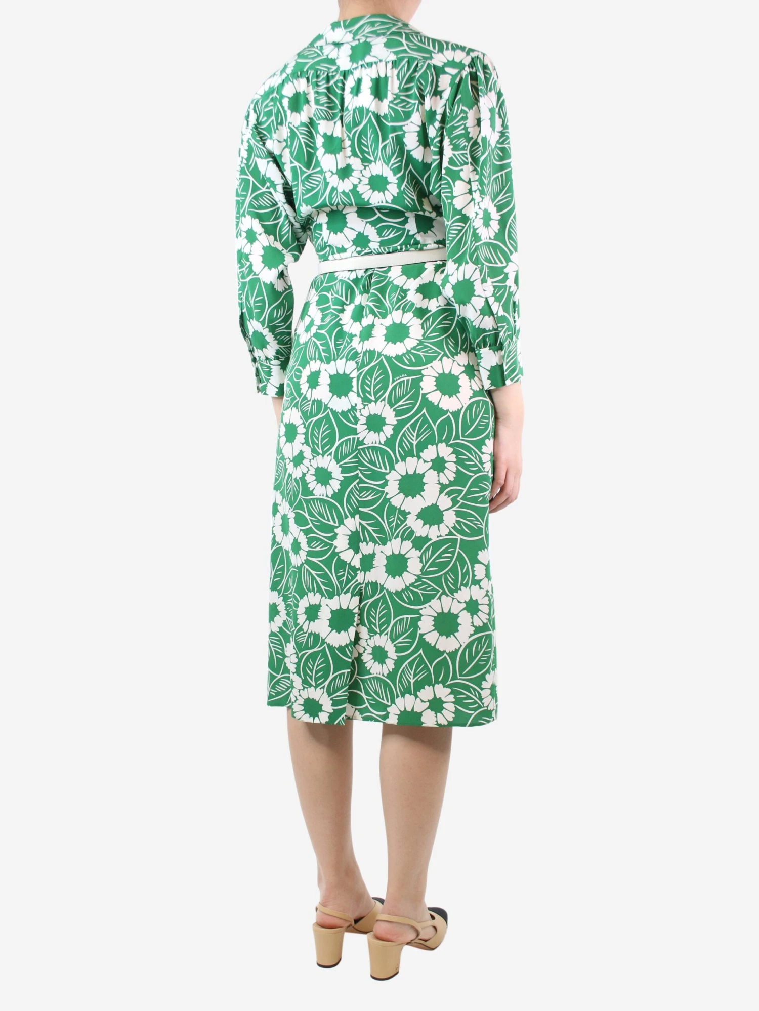 Prada green and white floral-printed silk midi dress, comes with slip and belt.