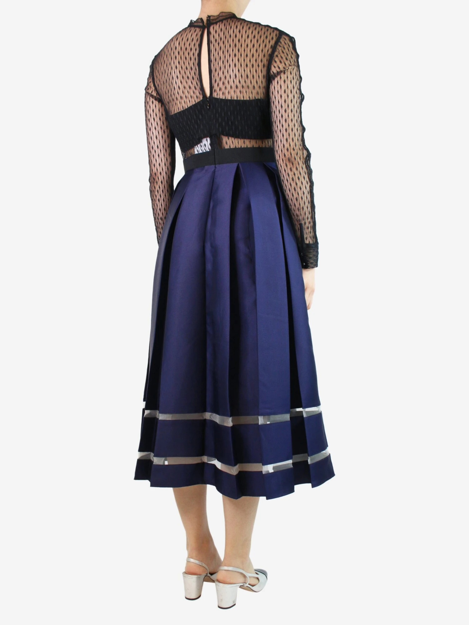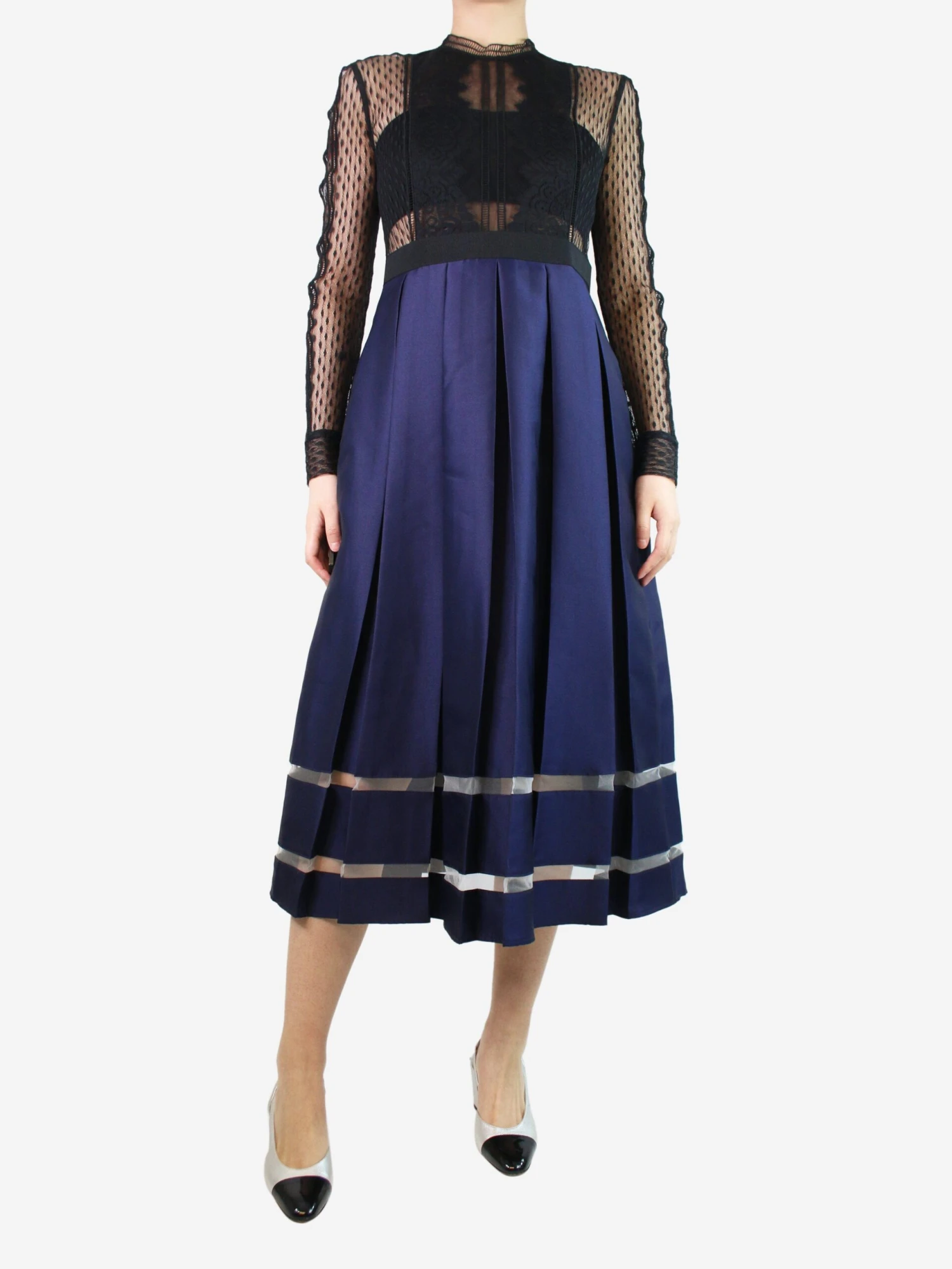 self-portrait blue and black lace pleated dress with a mesh trim on the skirt.